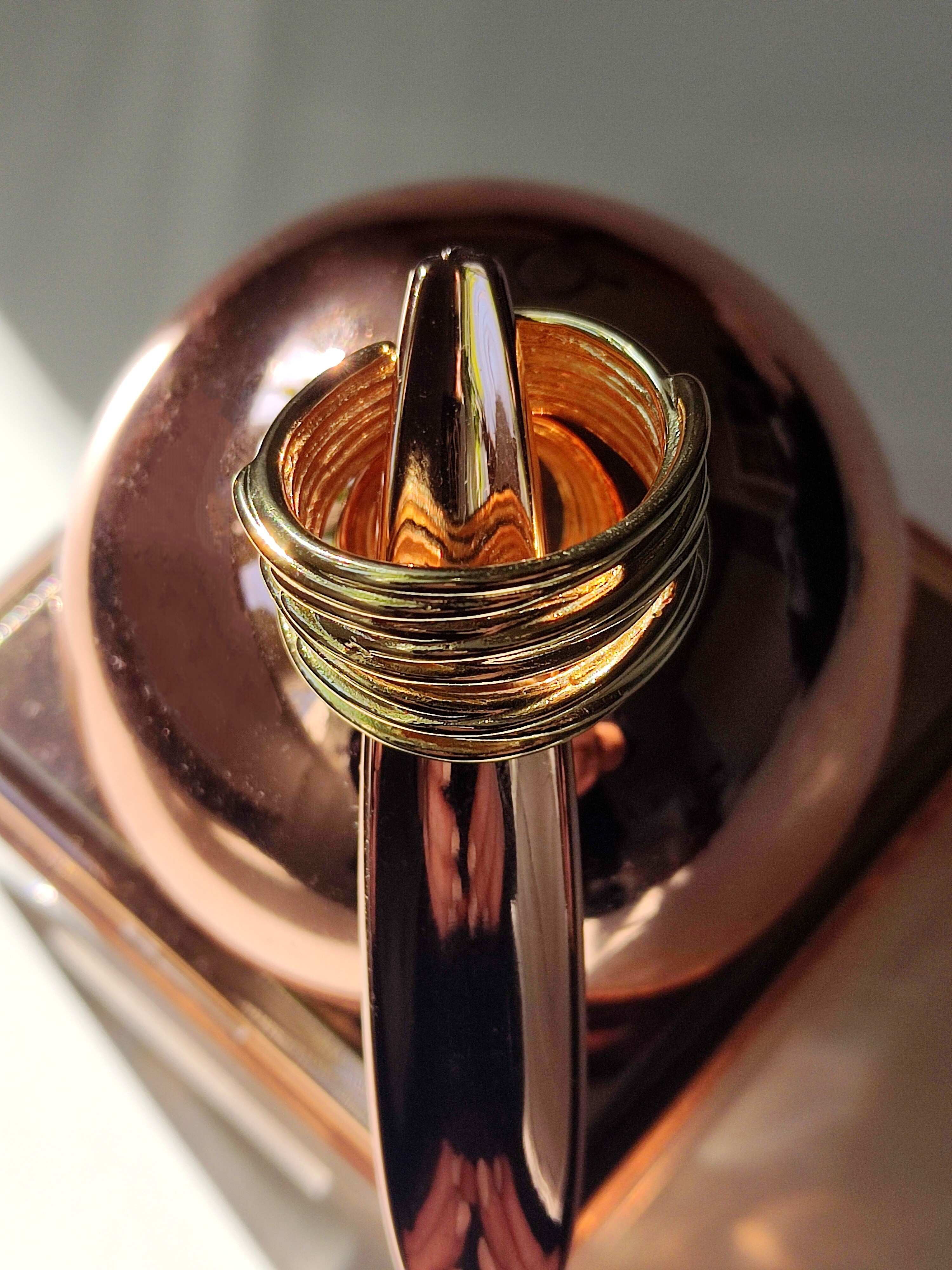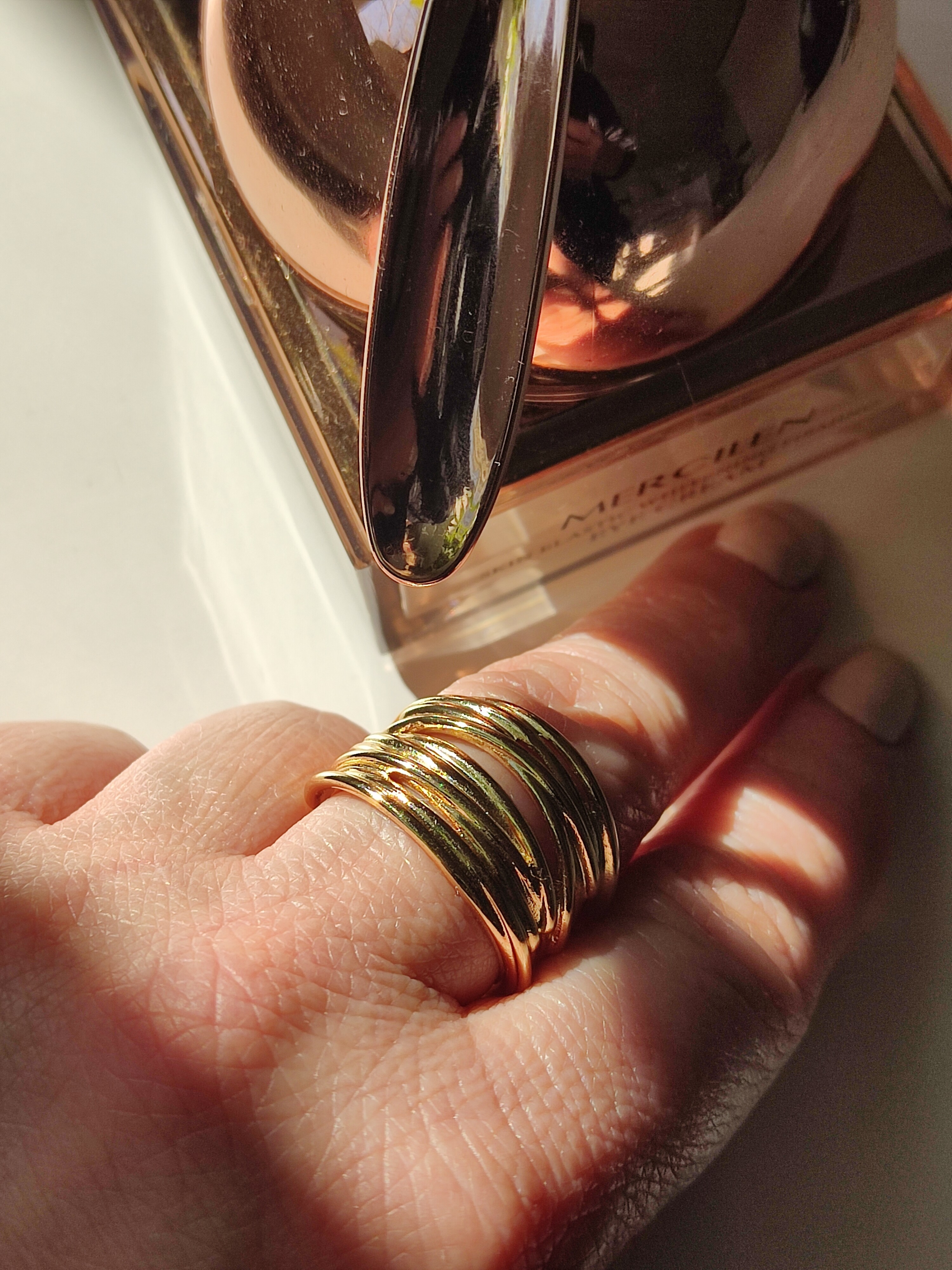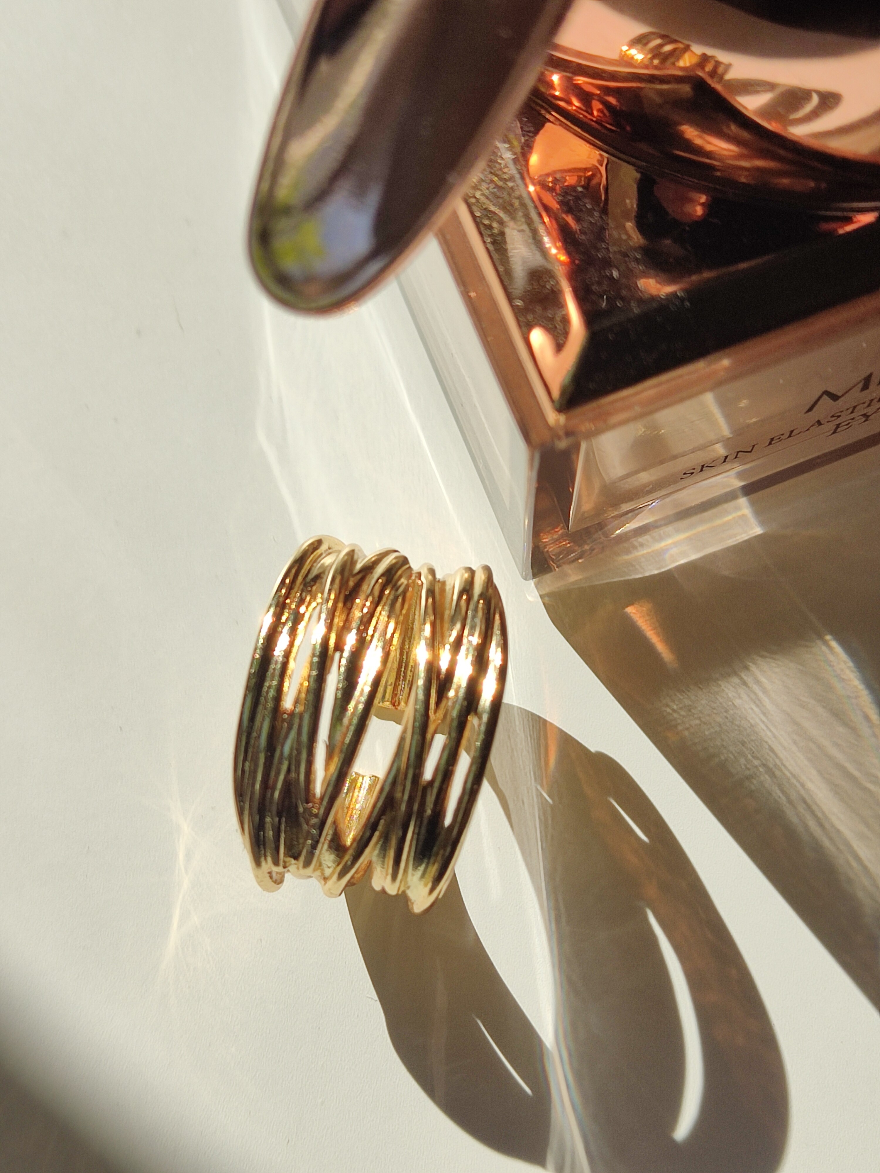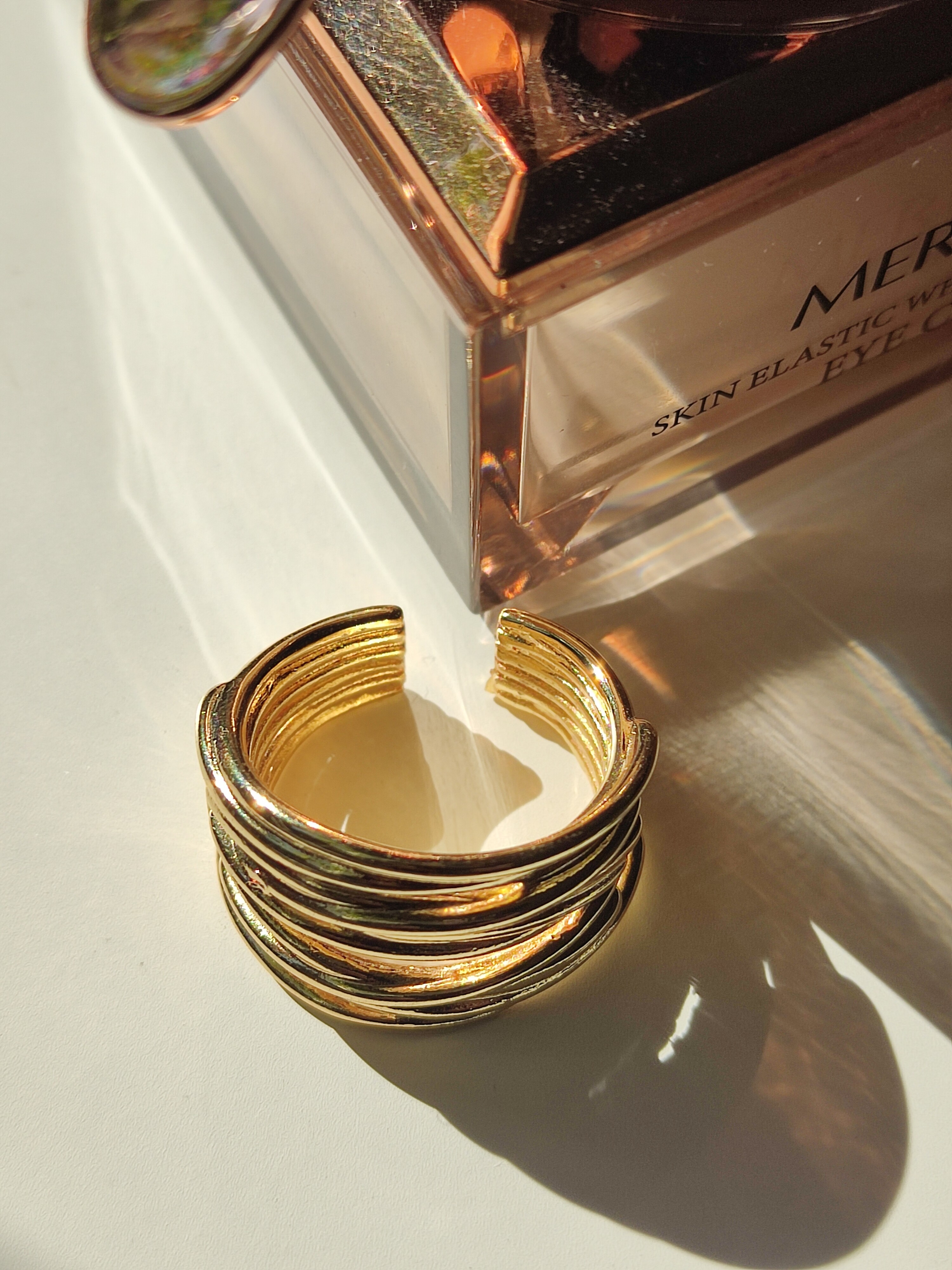 Ten pozłacany pierścionek ma nowoczesny, elegancki design. Jest szeroki i składa się z kilku cienkich, połączonych ze sobą pasm, które tworzą efekt warstwowej struktury. Jego powierzchnia jest błyszcząca i odbija światło, nadając mu luksusowy wygląd. Dodatkowo jest to model otwarty, co oznacza, że można go delikatnie dopasować do rozmiaru palca. Jego złoty kolor podkreśla szyk i doskonale komponuje się z innymi złotymi dodatkami.