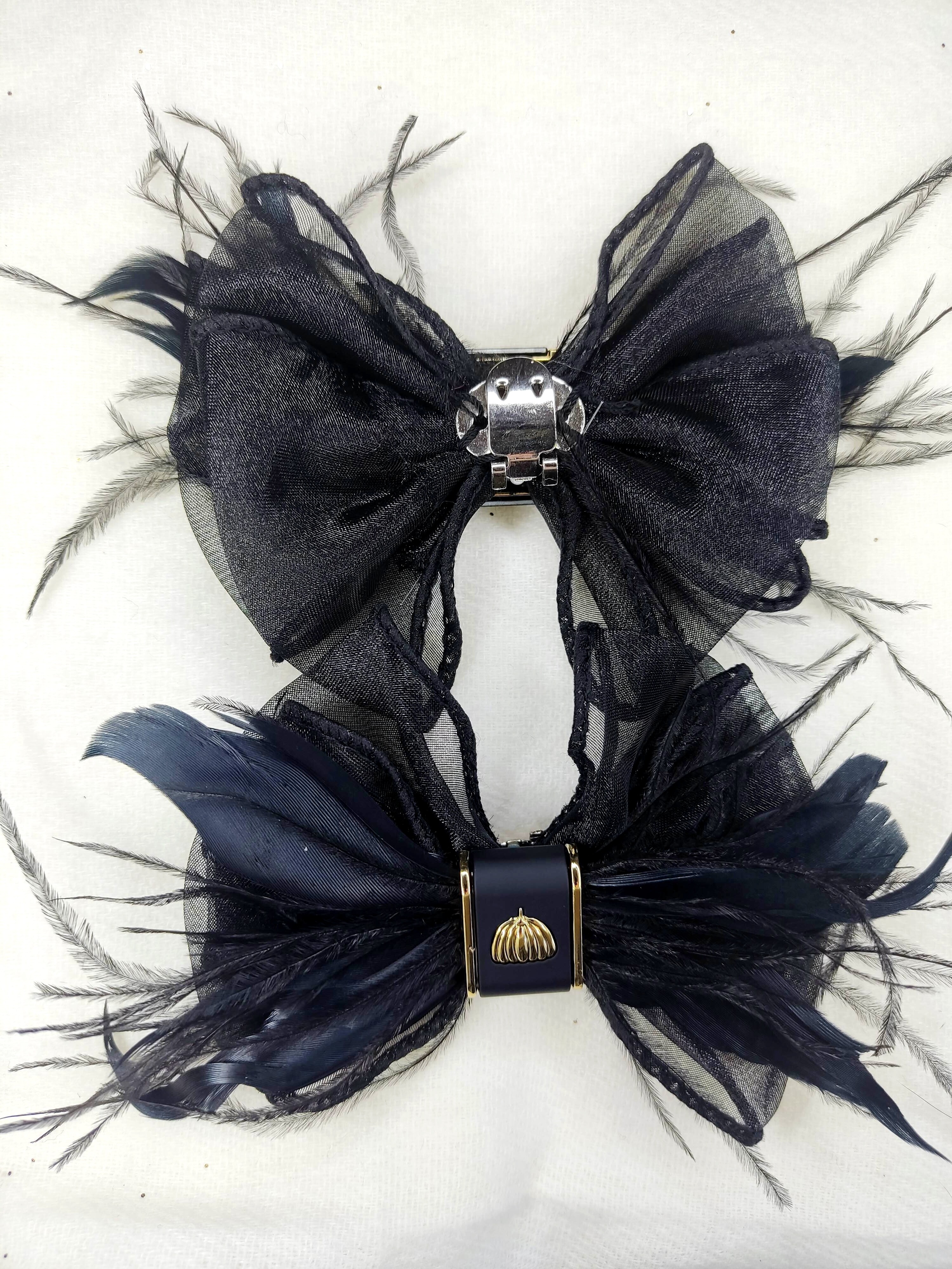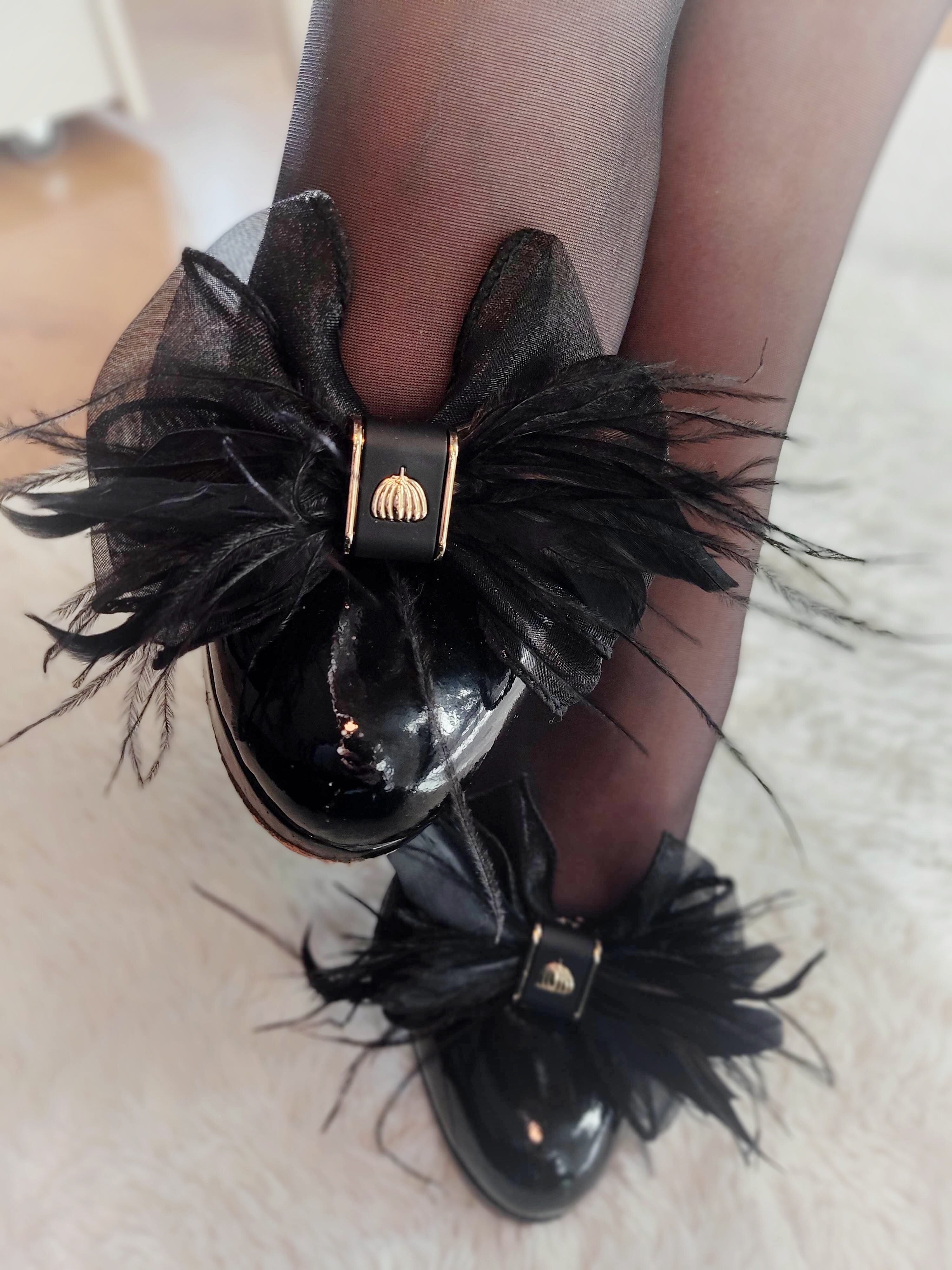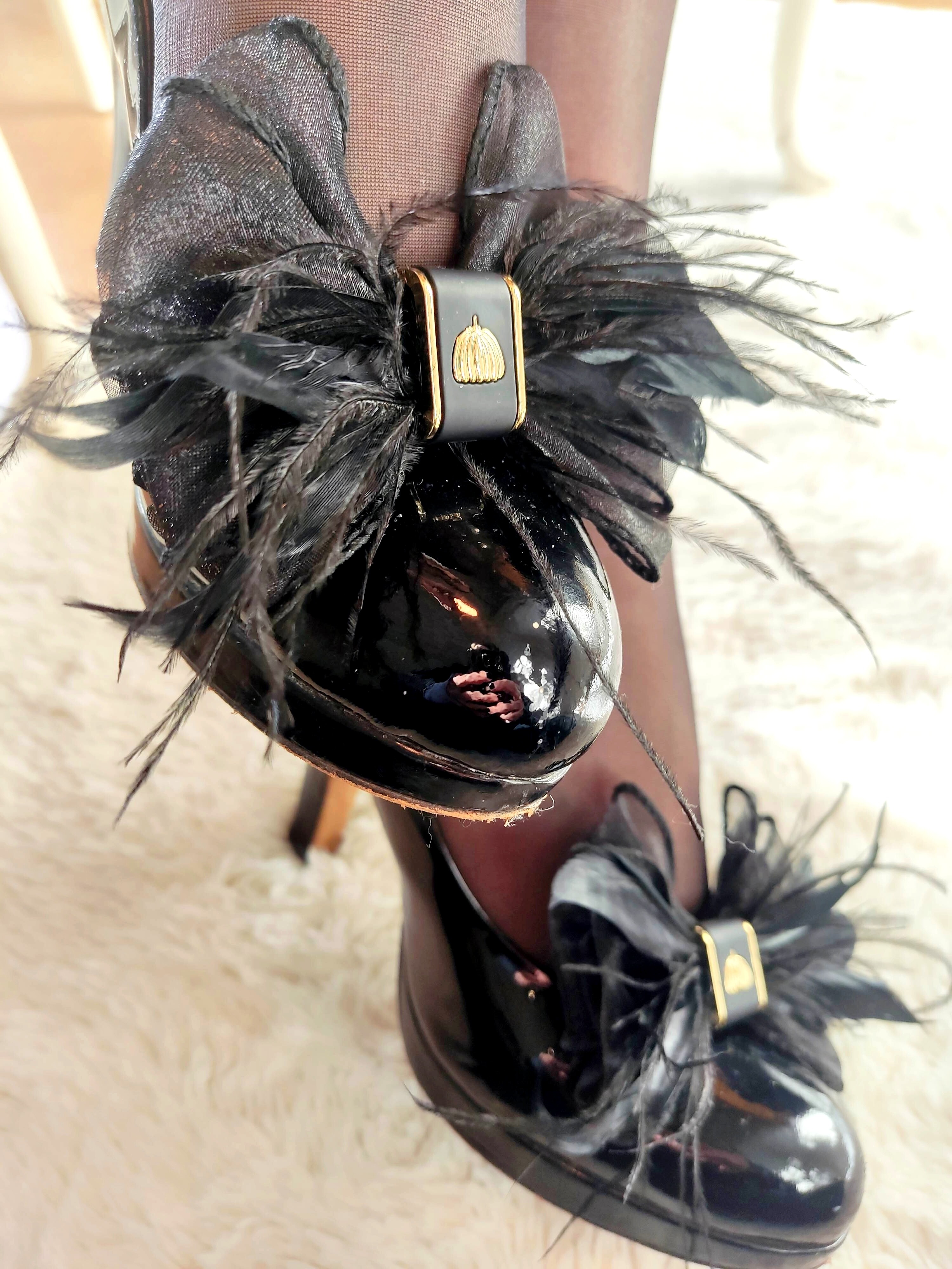 HIT na karnawał i nie tylko. Klipsy do butów w niesamowicie eleganckiej formie kokardy z piórami i pięknym złotym znakiem. Bardzo łatwy montaż, nie przeszkadzają w normalnym użytkowaniu butów.