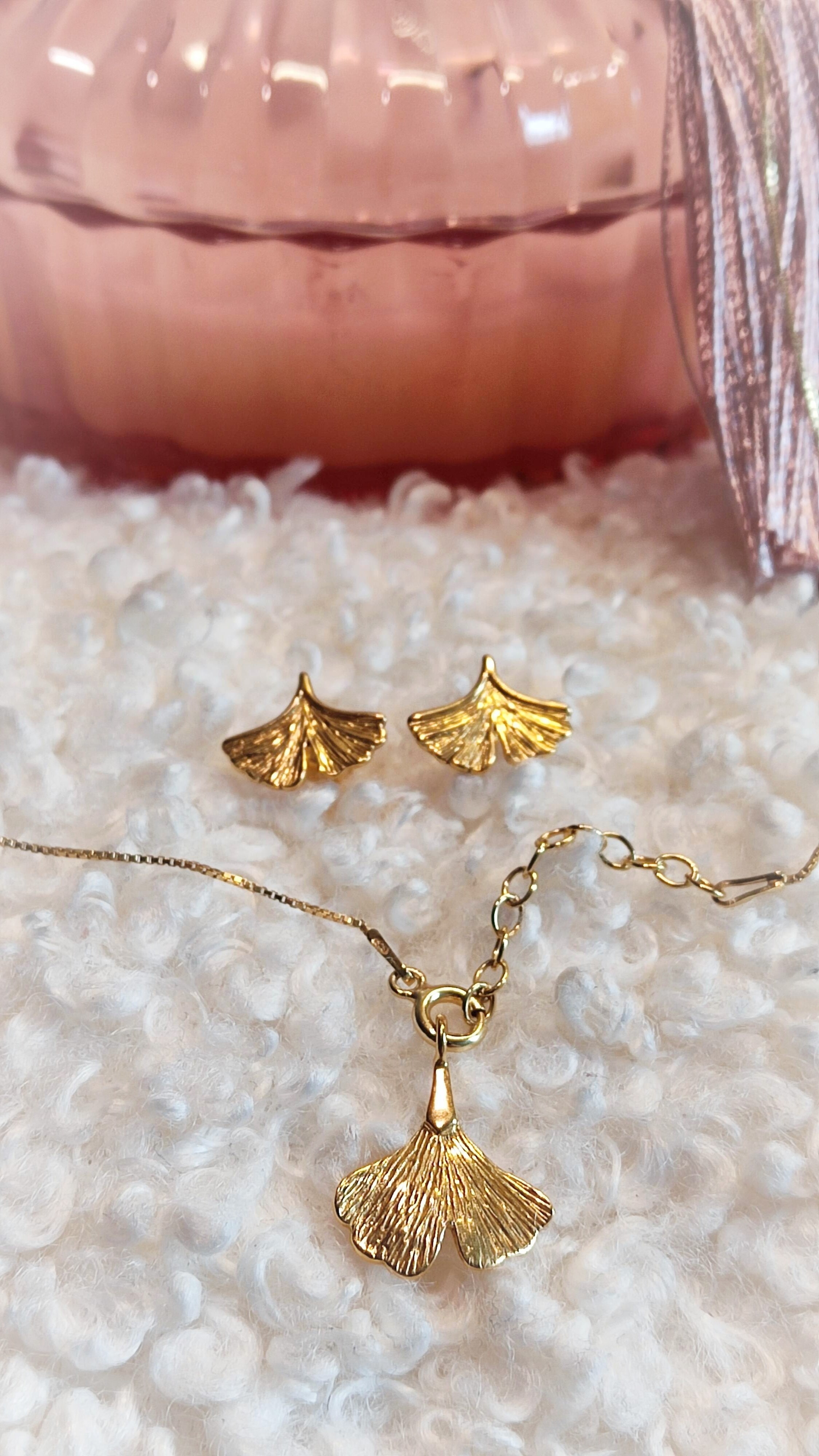 Dostępny również naszyjnik na bazie łańcuszka kostki 44 cm długości, z zawieszką w kształcie liścia miłorzębu japońskiego, pasująca do kolczyków.