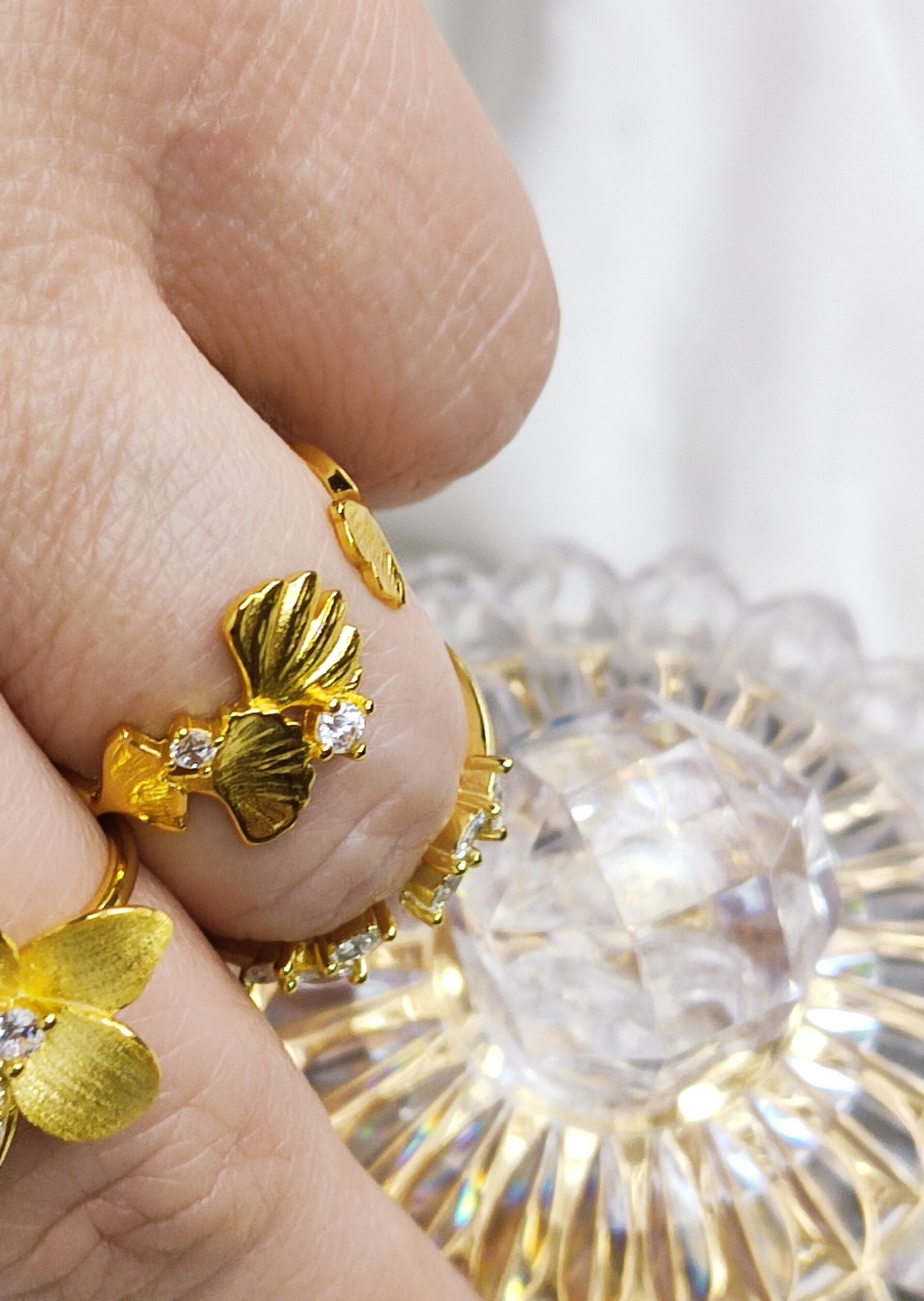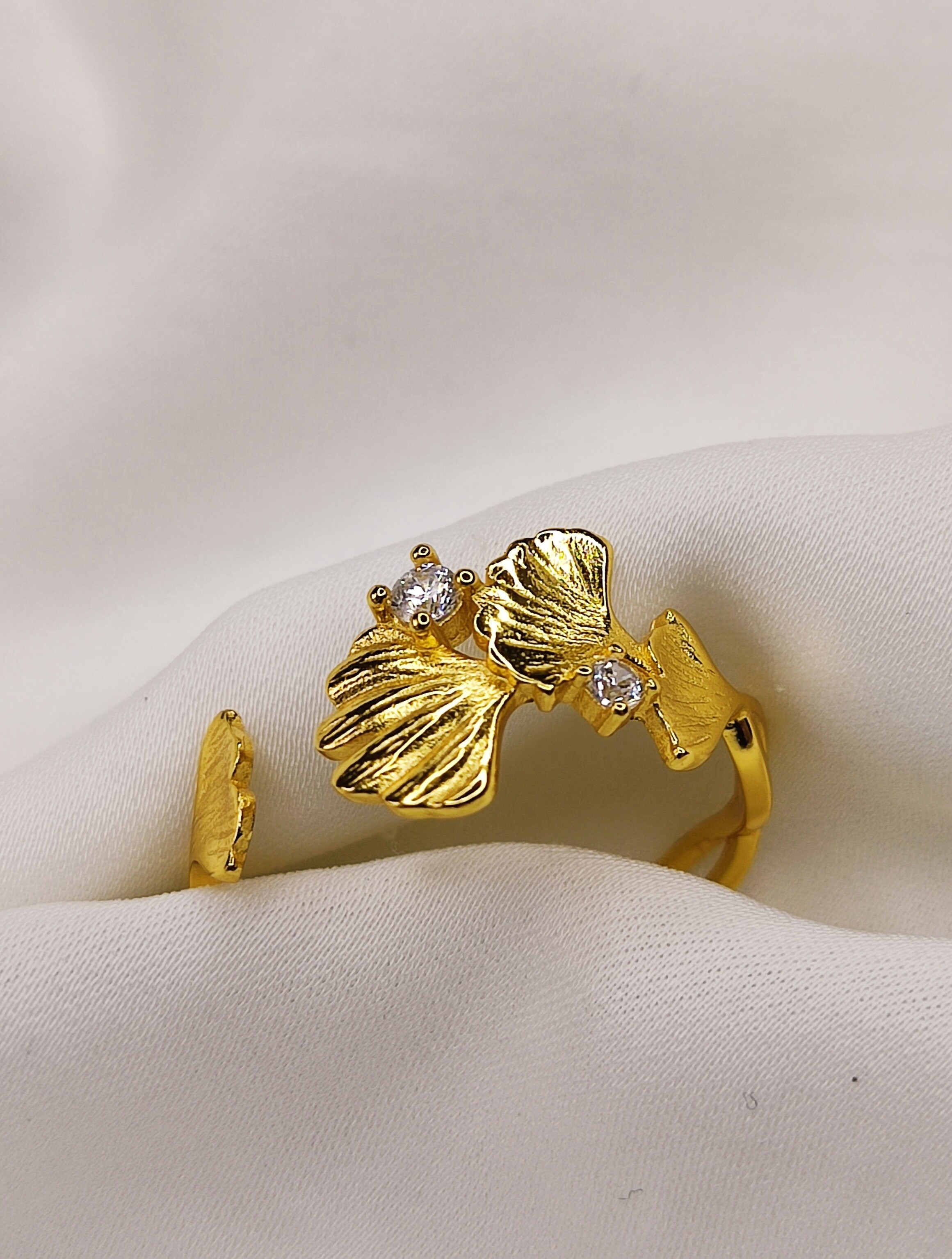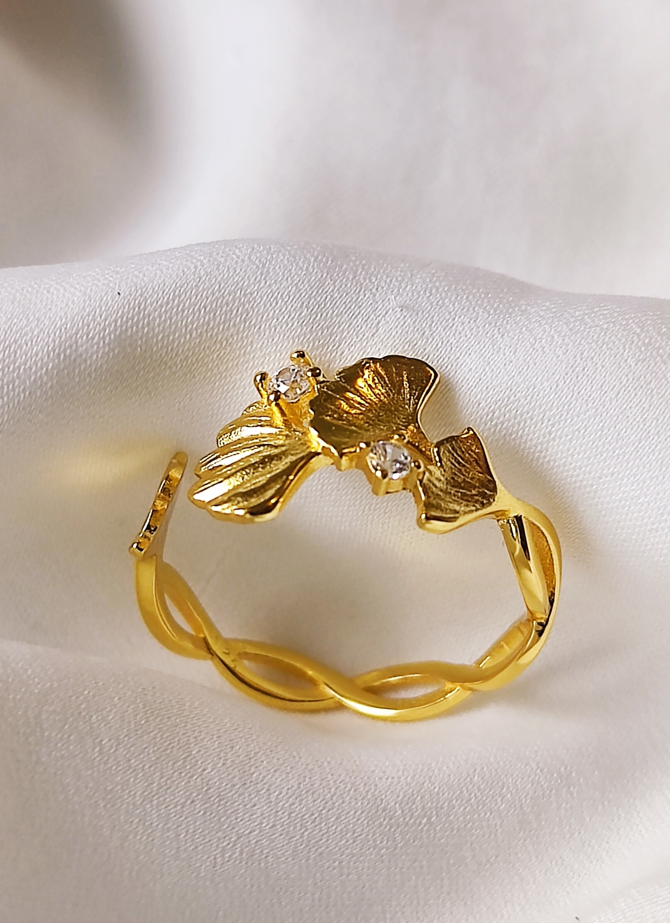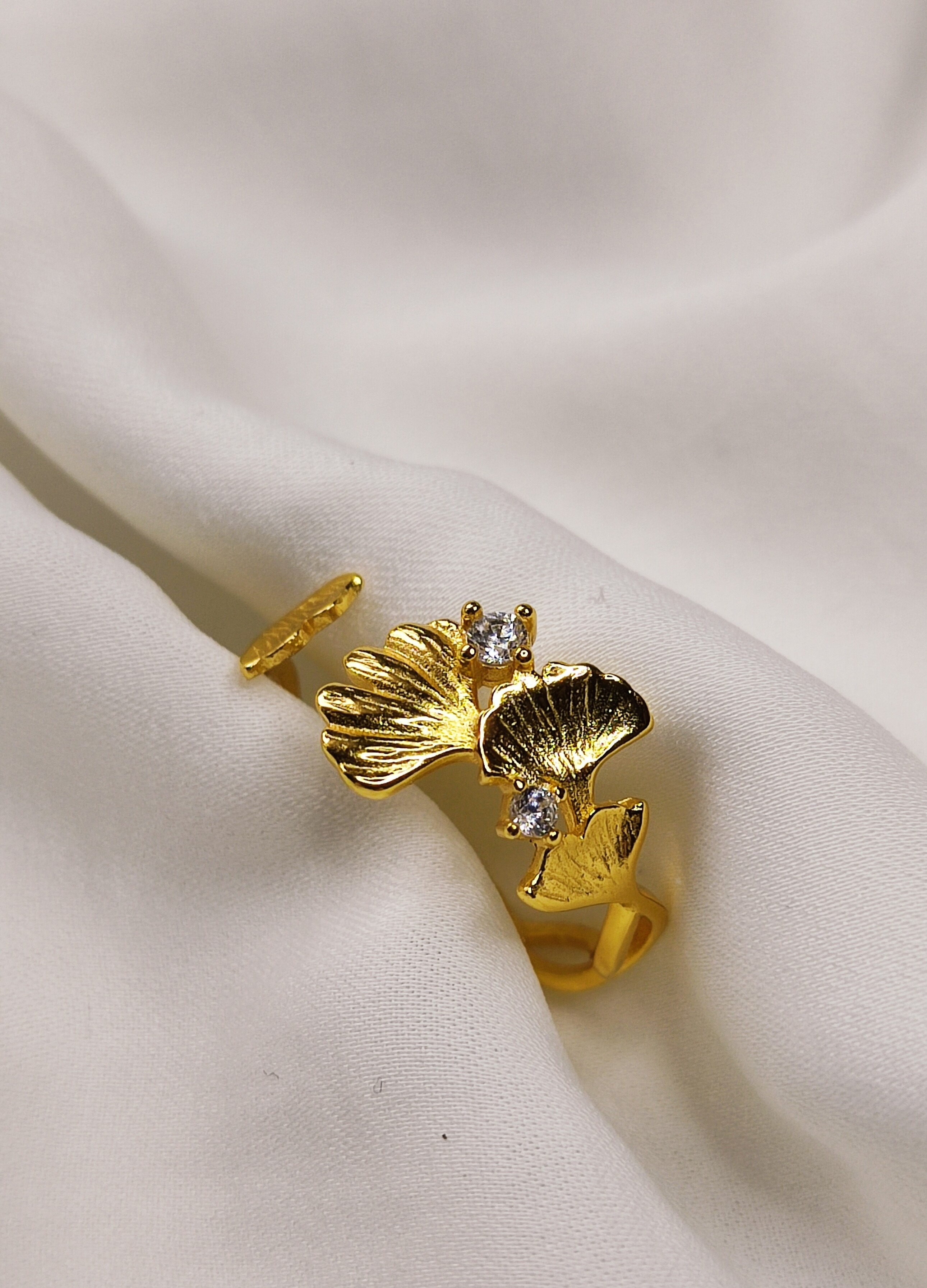 Pierścionek liście miłorzębu z Cyrkoniami