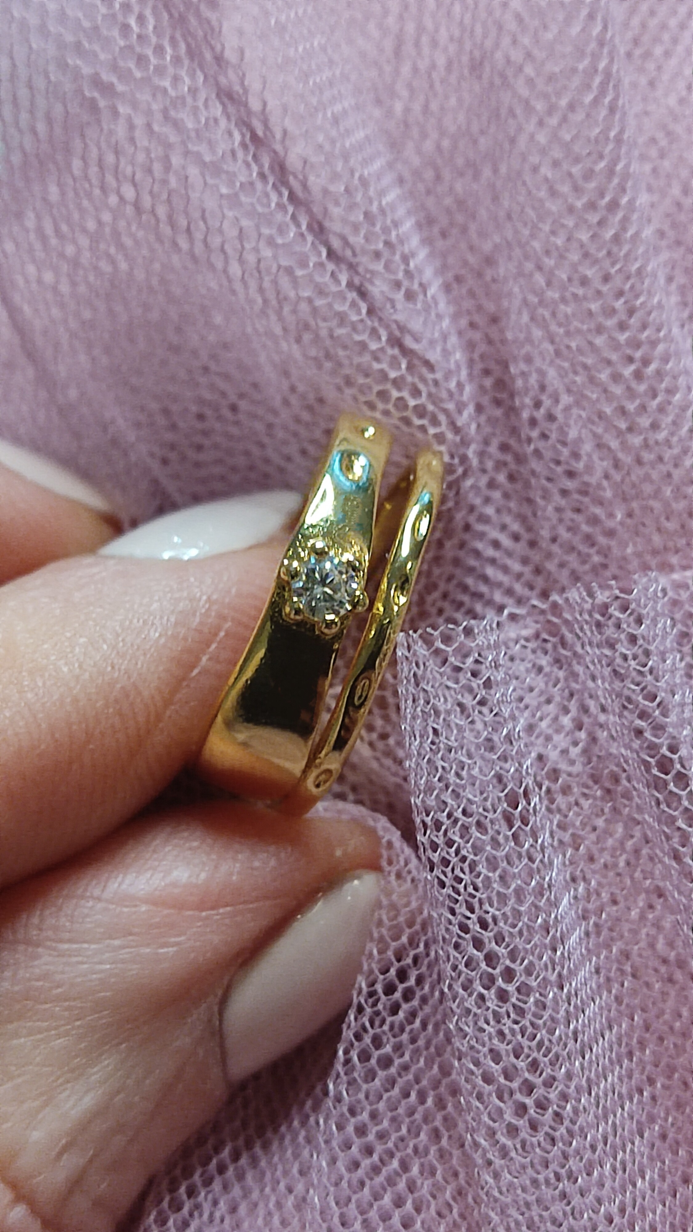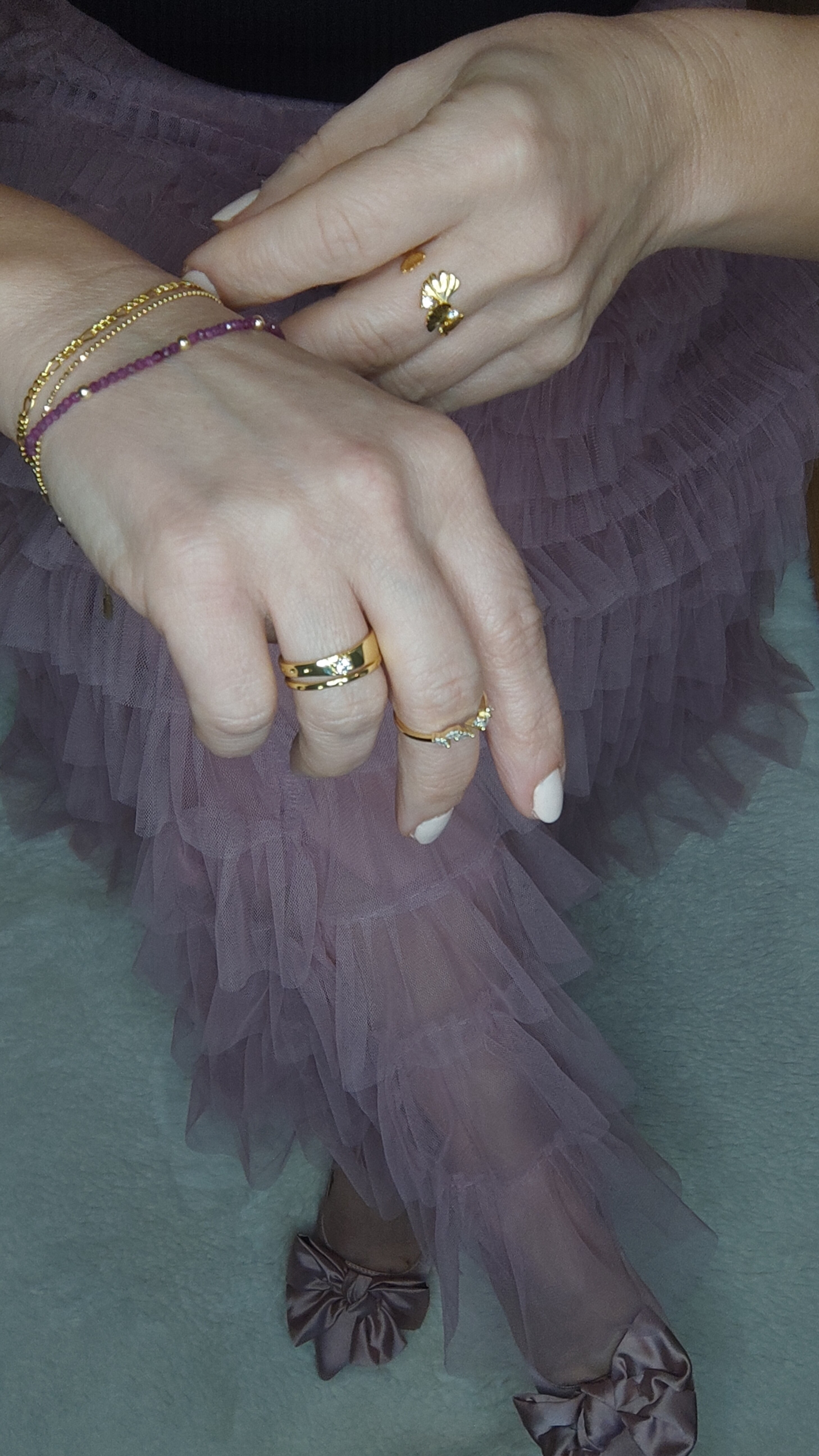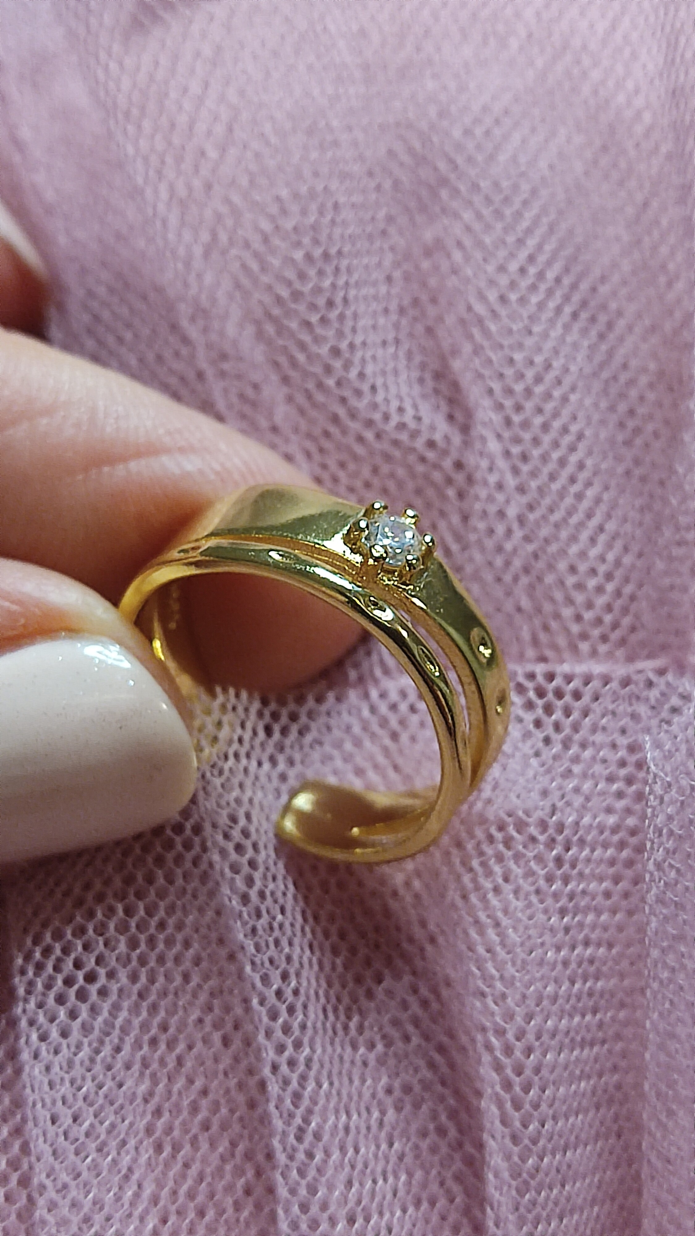 Pierścionek - obrączka z Cyrkoniami z wysokiej jakości Srebra 925 pozłacana 14K złotem. Delikatny, elegancki, o pięknej formie. Całość niezmiernie elegancka i nie tuzinkowa.